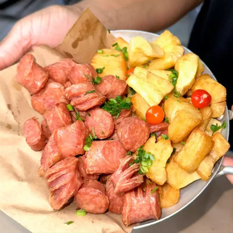 Além do torresmo, que é o carro chefe da casa, a casa também serve outros petiscos, como coxinha, polenta, fritas, camarão e mais!