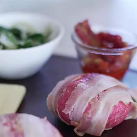 – Agora com tiras de bacon, você vai envolver seu polpetone por completo!