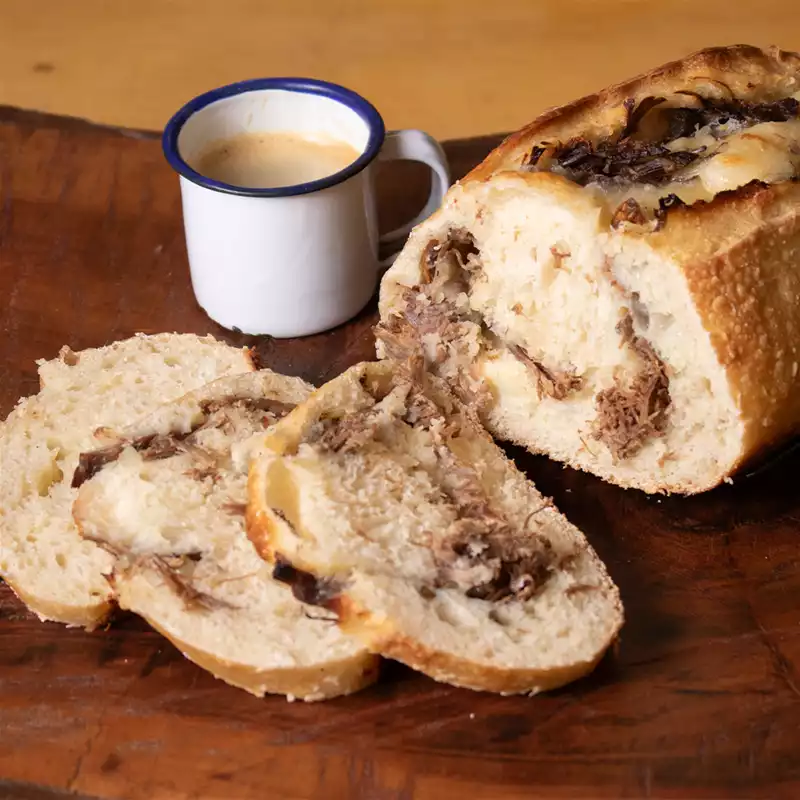 - Receita: :Uma receita rústica e saborosa que combina a maciez do peito de boi cozido lentamente e a cremosidade de um purê mandioca amanteigado, intercalando lascas de queijo minas padrão e uma generosa camada de queijo muçarela derretido por cima.