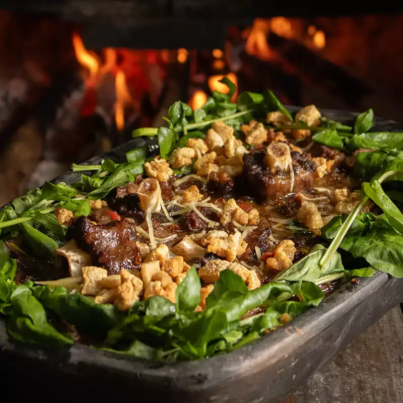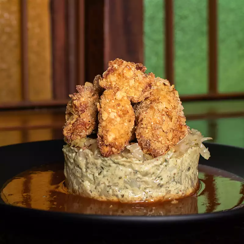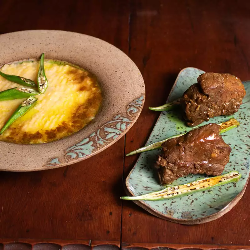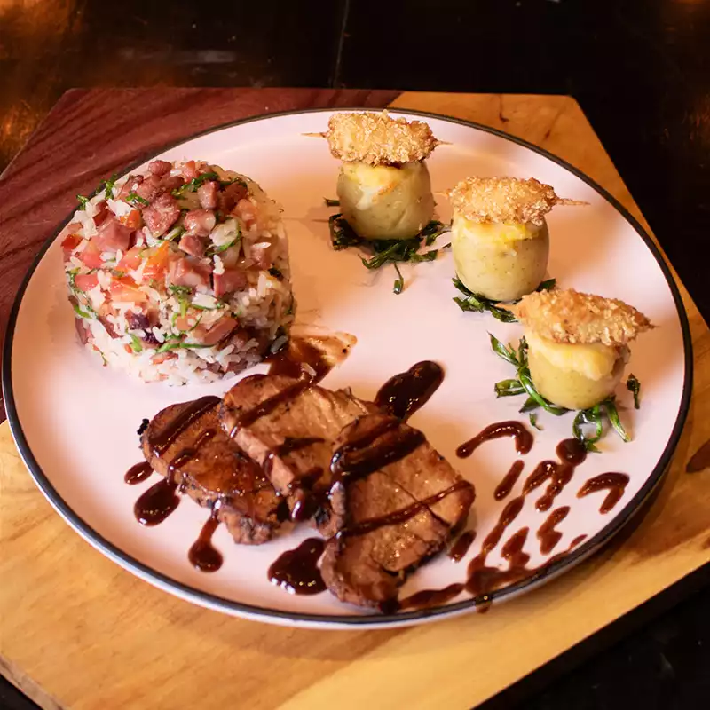 - Receita: Bolinho de mandioca com costela de chão, recheado com queijo minas padrão e empanado no parmesão com farinha panko. Acompanha molho picante de pimenta dedo-demoça com alho, cebola e ervas frescas.