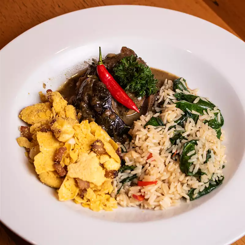 - Receita: Ravioli duplo: recheado com porco e amêndoas defumadas de um lado, e queijo Canastra do outro. Servido sobre fonduta de ricota e provolone, finalizado com demi-glace de porco, noz-moscada, azeite verde e farofinha crocante de tomilho