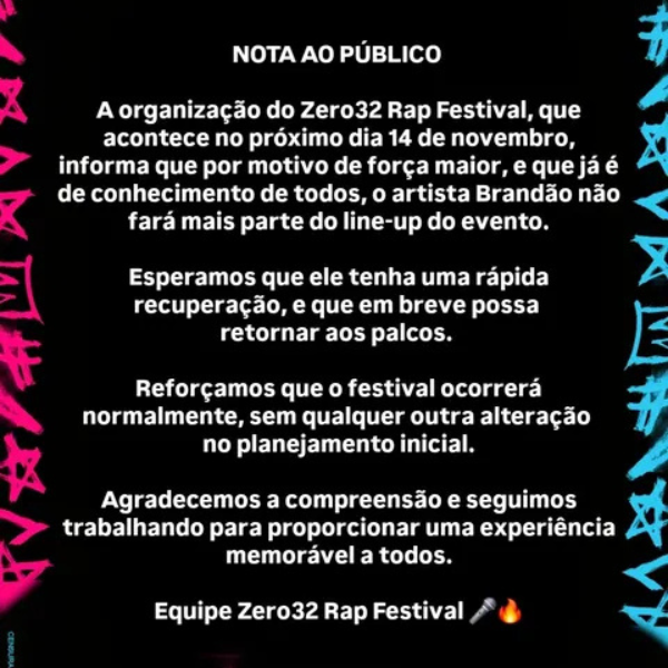 A participação do Brandão no evento foi cancelada pela produção conforme o comunicado abaixo: