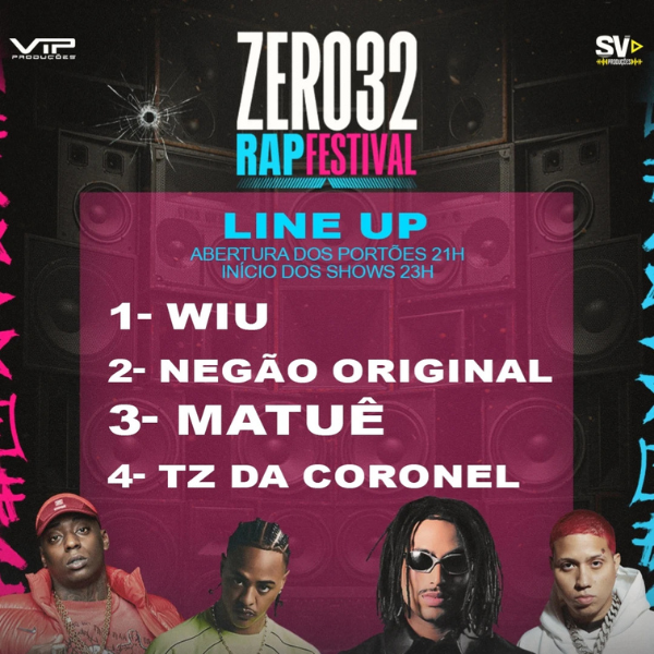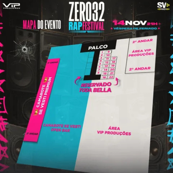 No dia 14/11 (sexta-feira), a partir das 21h, véspera de feriado, ocorre o Zero 32 Rap Festival (@zero32rapfestival), no Terrazzo.