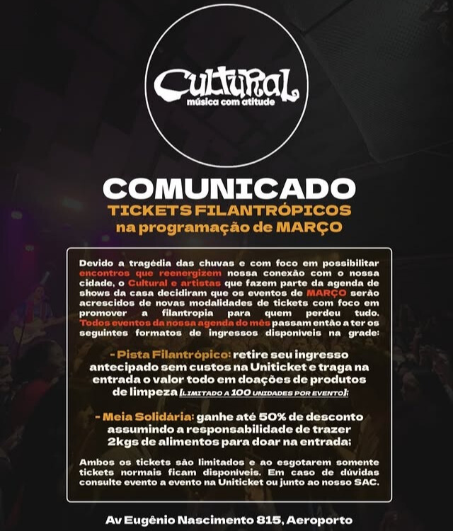 Os eventos do mês de março terão ingressos filantrópicos para ajudar as vítimas das chuvas que atingiram Juiz de Fora. Confira como a iniciativa funciona: