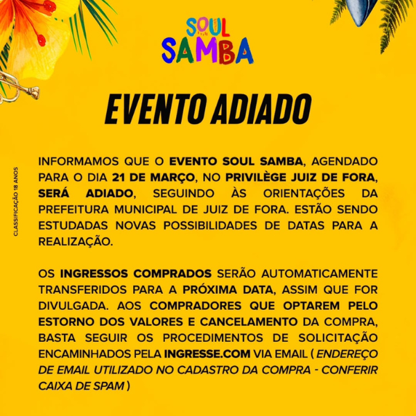 🎟️ Ingressos: Os ingressos que já foram adquiridos serão válidos para a nova data. Caso você não possa comparecer, o estorno será feito diretamente pela ticketeria ingresse.com, as orientações serão encaminhadas pelo e-mail cadastrado,