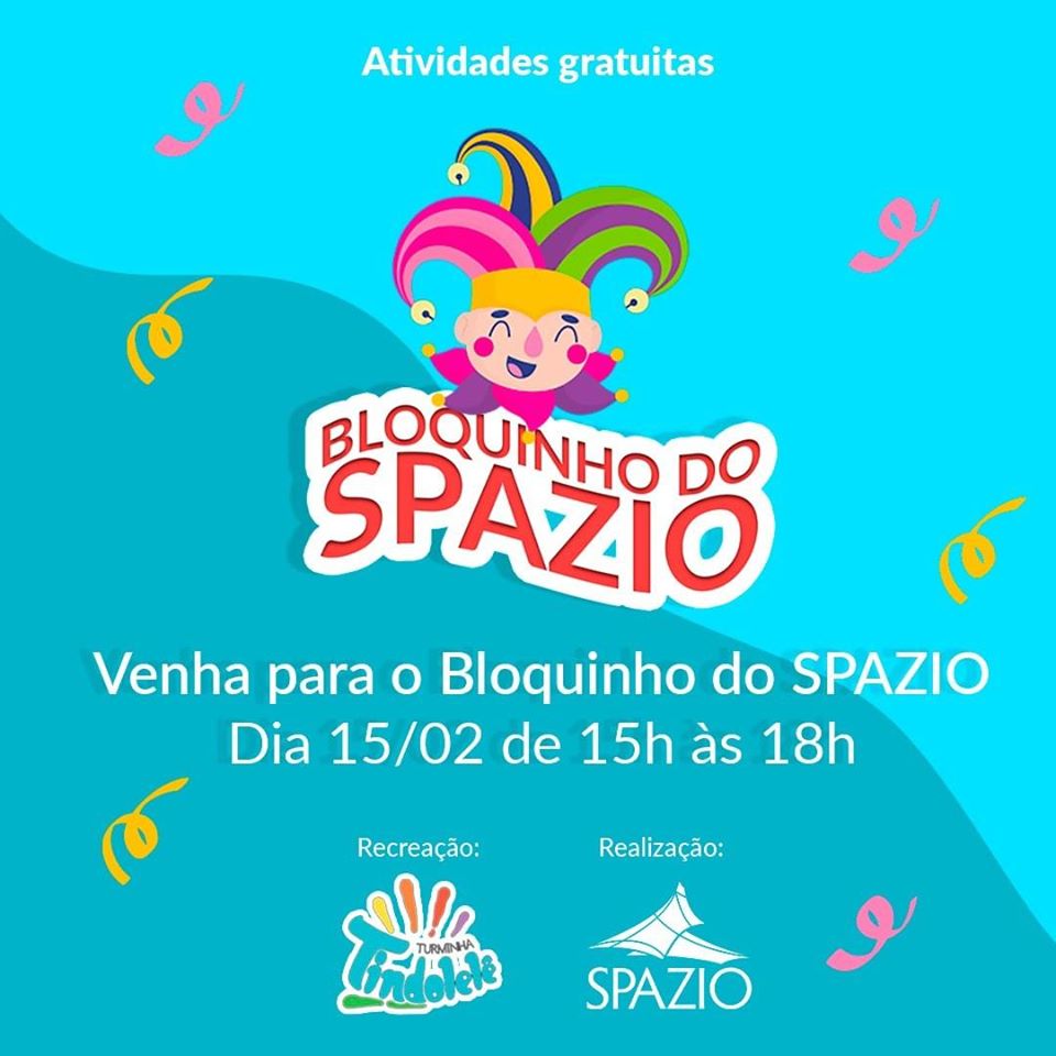 Na tarde do dia 15/02 (sábado) as crianças são convidadas a curtirem o Bailinho do Spazio, no Spazio Design. Na programação está incluso oficina de máscaras, oficina de bijuterias, salão de beleza infantil, pintura artística, caça ao confete, pipocas e recreação com a Turminha Tindolelê.