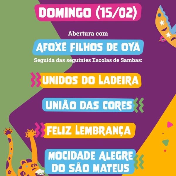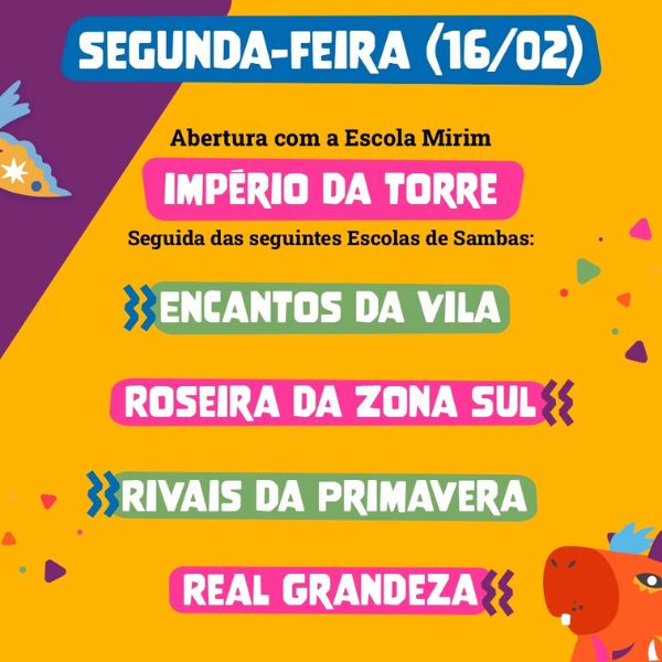Nos dias 15/02 (domingo) e 16/02 (segunda-feira) ocorrem os desfiles de carnaval das escolas de samba de Juiz de Fora.