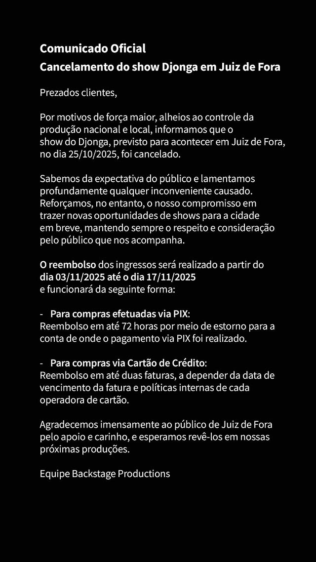 O show do Djonga em Juiz de Fora, que ocorreria no dia 25/10 (sábado), no Terrazzo, foi CANCELADO pela produção do evento.