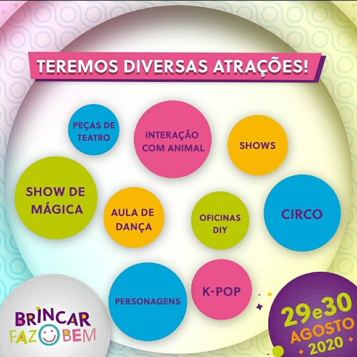 Nos dias 29/08 (sábado) e 30/08 (domingo), sempre das 15h às 18h, ocorrerá o Festival Online “Brincar Faz O Bem”. Na programação, desenhos, bandas, histórias, oficinas, mágica e apresentação de youtubers.