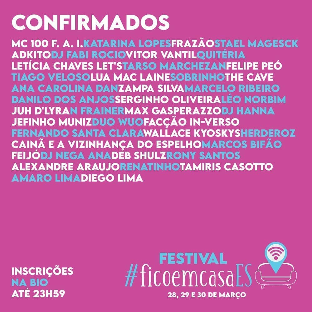 Do dia 28 a 30 de março (sábado a segunda-feira), ocorre o Festival @ficoemcasaES. A iniciativa é realizada voluntariamente com o objetivo de multiplicar e pulverizar o trabalho dos talentos do Espírito Santo. Confira os artistas que fazem parte do projeto abaixo: