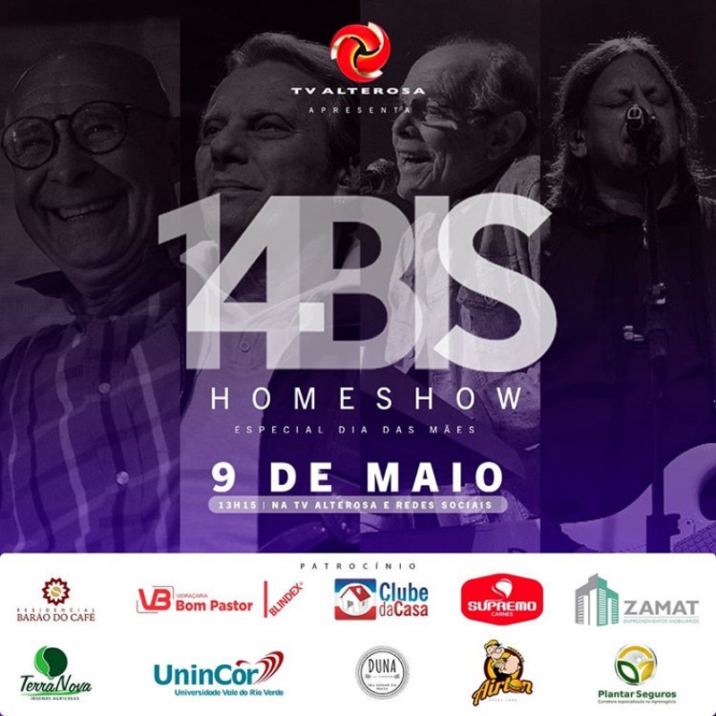 No dia 09/05 (sábado), a partir das 13h20, ocorre a live do 14 Bis com uma apresentação em homenagem ao Dia das Mães. A transmissão será por meio da TV Alterosa Sul de Minas e suas redes sociais.