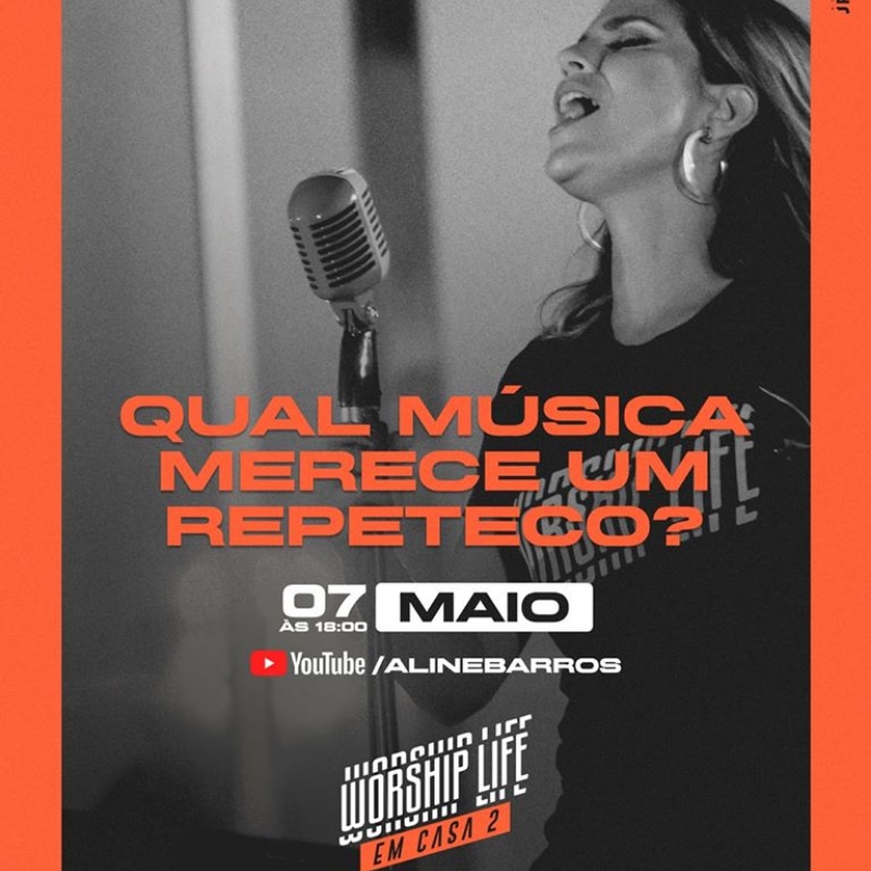 A segunda live da Aline Barros será no dia 07/05 (quinta-feira), às 18h, com transmissão diretamente do seu canal oficial no Youtube! Para o repertório, a cantora conta com a ajuda dos fãs na escolha das músicas.