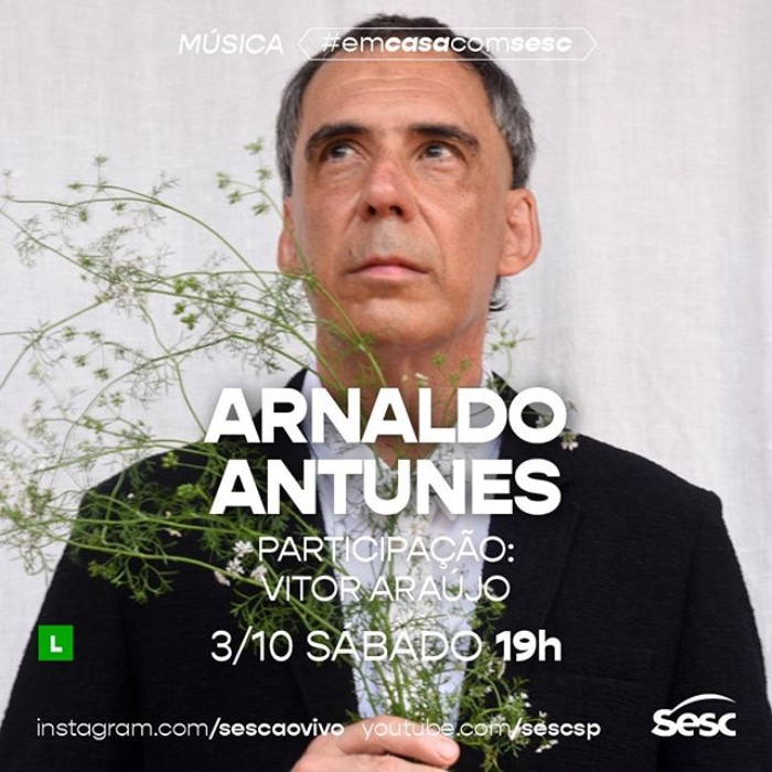 No dia 03/10 (sábado), a partir das 19h, ocorre a live do Arnaldo Antunes.