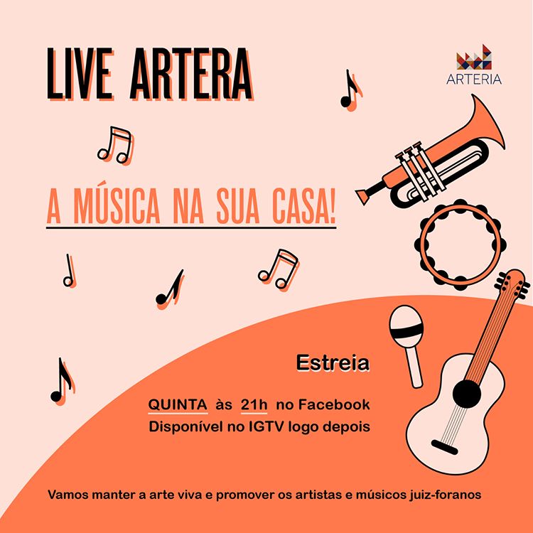 O projeto Live Artera, da Arteria Fábrica de Cultura, é estrado dia 26/03 (quinta) às 21h no Facebook. O objetivo é levar a música dos artistas juiz-foranos até a casa das pessoas por meio de apresentações ao vivo, visto a atual situação em que deve-se permanecer em casa. Após a apresentação o conteúdo é disponibilizado no IGTV do Instagram.