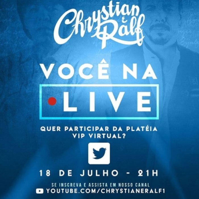 No dia 18/07 (sábado), a partir das 21h, ocorre a live da dupla Chrystian & Ralf. No repertório, músicas que marcaram gerações do sertanejo no Brasil. A transmissão ocorre por meio do canal oficial da dupla no Youtube.