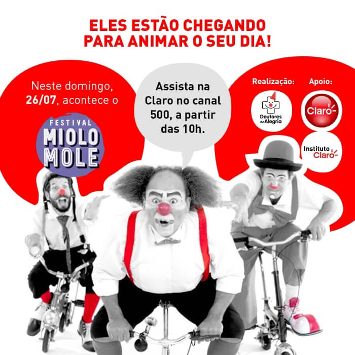 No dia 26/07 (domingo), a partir das 10h, ocorre a live dos Doutores da Alegria, com apresentação do projeto “Festival Miolo Mole �?” Os bons encontros não têm distância�?�. Serão sete horas de duração, com atividades para família, brincadeiras, contação de histórias e gincanas interativas.