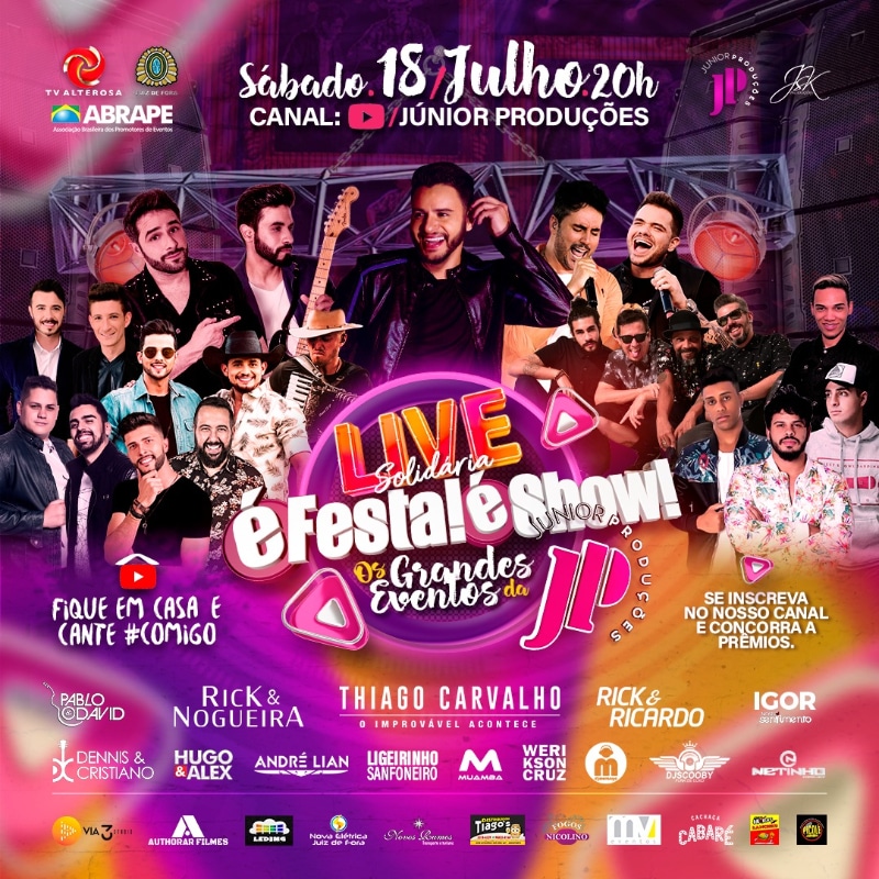 No dia 18/07 (sábado), a partir das 20h, ocorre a live solidária “�? Festa! �? show!” assinada pela JP Produções.