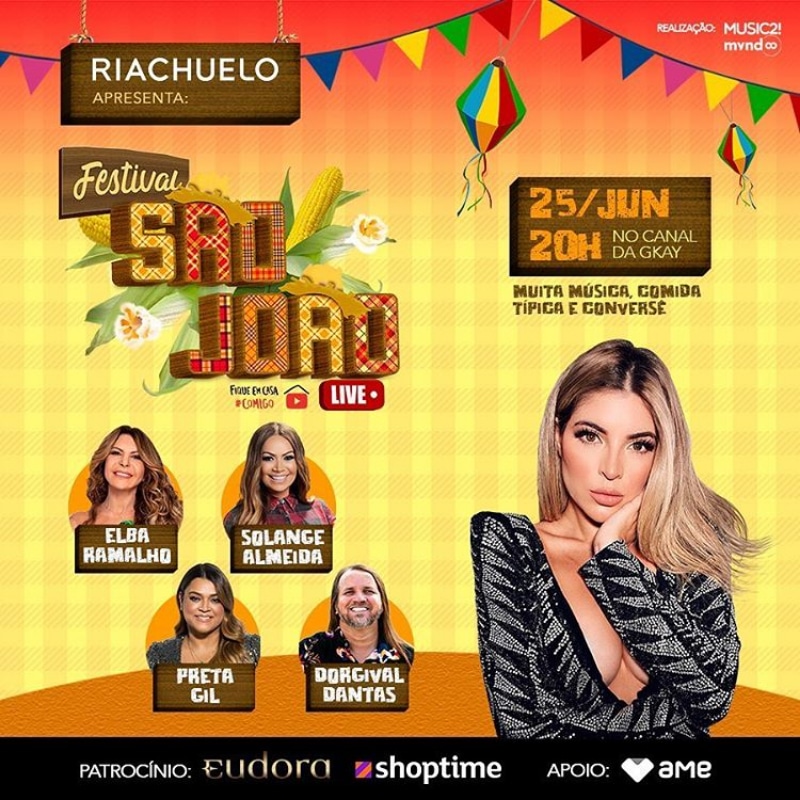 No dia 25/06 (quinta-feira), a partir das 20h, ocorre a live do Festival São João, com shows de Elba Ramalho, Solange Almeida, Preta Gil e Dorgival Dantas. A apresentação ficará por conta da youtuber GKay.