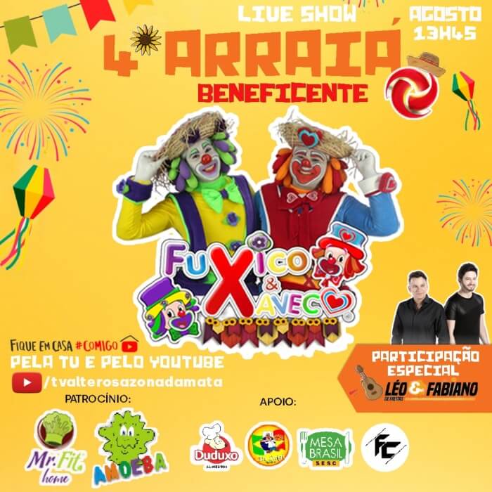 No dia 01/08 (sábado), a partir das 13h45, ocorre a Live do Fuxico & Xaveco com a realização do 4º Arraiá Beneficente da dupla de palhaços. O evento terá atividades recreativas, Concurso Rei e Rainha Caipira Fashion, quadrilha online e a participação da dupla Léo de Freitas & Fabiano.