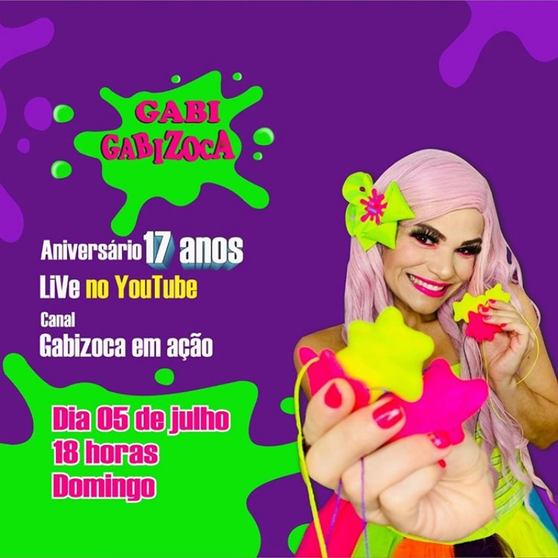 No dia 05/07 (domingo), a partir das 18h, ocorre a live da Gabi Gabizoca, com transmissão em seu canal oficial do Youtube. A apresentação será uma super festa em comemoração aos 17 anos de Gabizoca.