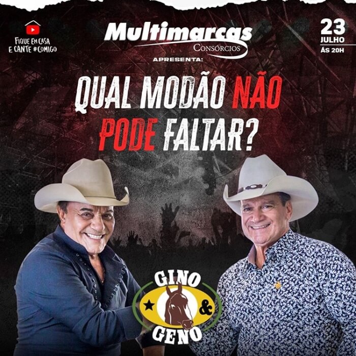 A nova live do Gino & Geno ocorre no dia 23/07 (quinta-feira), a partir das 20h. O show ao vivo será transmitido por meio do canal oficial dos sertanejos no Youtube. O evento faz parte do movimento “Fique Em Casa e Cante #Comigo”.