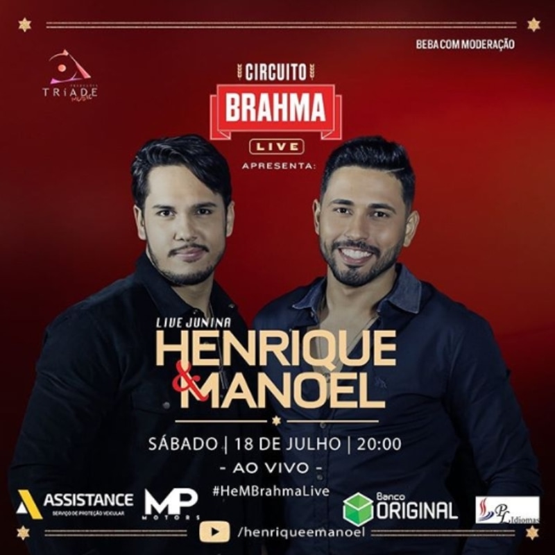 No dia 18/07 (sábado), a partir das 20h, ocorre live da dupla sertaneja Henrique & Manoel. O evento que faz parte do “Circuito Brahma” será exibida gratuitamente por meio do canal oficial da dupla no Youtube.