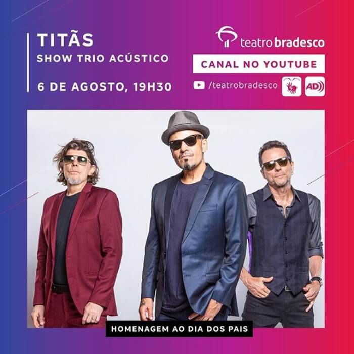 No dia 06/08 (quinta-feira), a partir das 19h30, ocorre a nova live do Titãs. Dessa vez, a apresentação será um acústico em homenagem ao Dia dos Pais. A transmissão será realizada no canal oficial do Teatro Bradesco no Youtube.