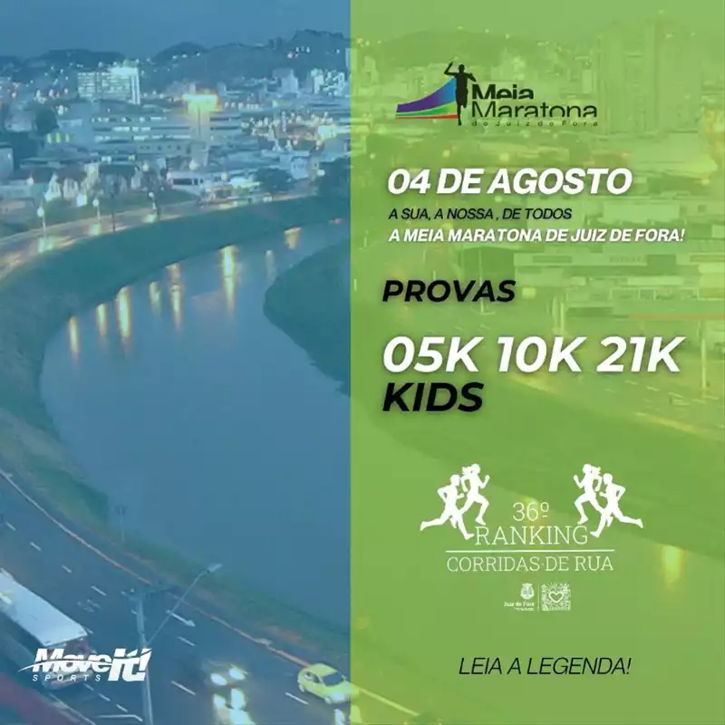 No dia 04/08 (domingo) ocorre a meia maratona de Juiz de Fora, com largada às 7h e com provas de diferentes distâncias: 21km, 10km e 5km. A prova de 21km é válida pelo 36º Ranking de Corrida de Rua de Juiz de Fora.