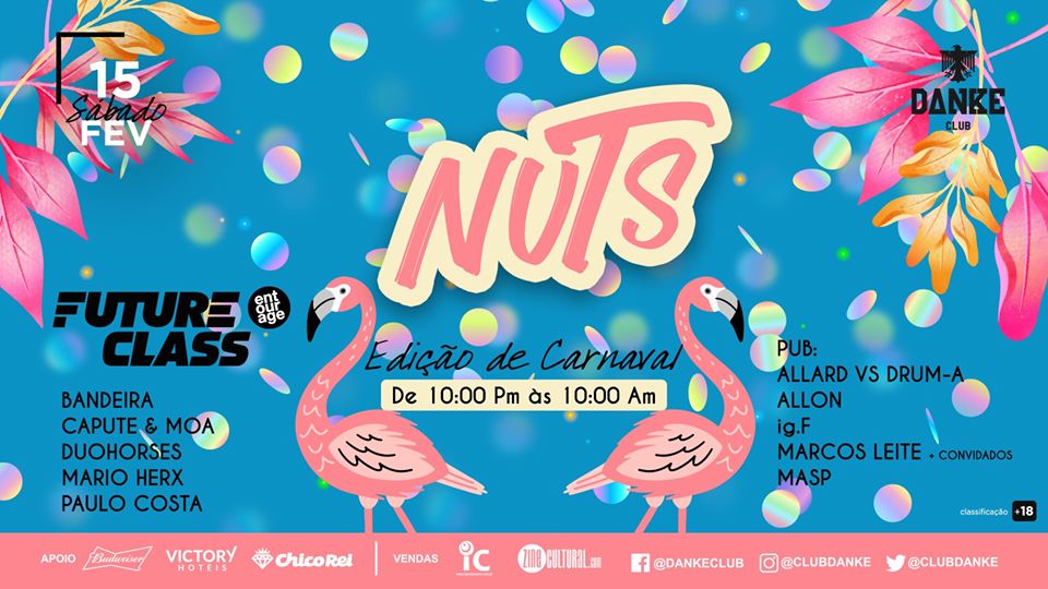 No dia 15 de fevereiro (sábado), ocorre a edição de carnaval da festa Nuts, na Danke Club. O evento, que fez história no ninho da casa em 2018, é dedicado à música eletrônica, para proporcionar ao público uma experiência única.