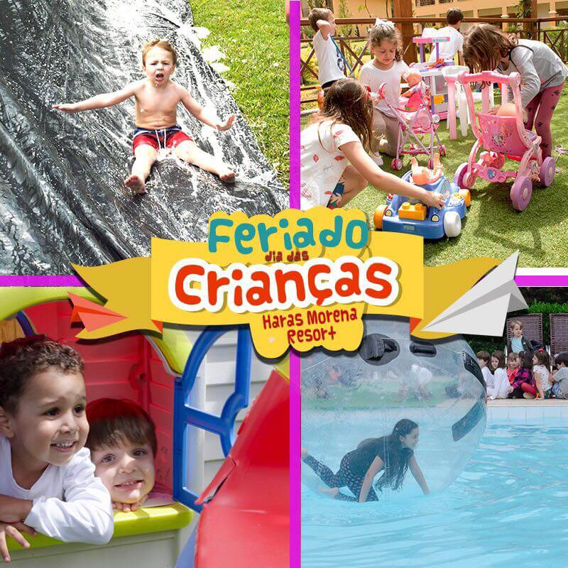 No Haras Morena Resort, são três dias de comemoração, de 12 a 15 d eoutubro. O local conta com piscinas, lago de água mineral, pedalinho, campo de golfe, quadra de tenis, vôlei, futebol, ping pong, totó, sinuca, entre outras atividades especiais para o Dia das Crianças. Confira a programação: