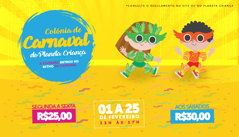 Além de baile e bloquinhos, tem Colônia de Carnaval também, no Santa Cruz Shopping! O melhor de tudo é que está bem fácil participar desta colônia, já que ela acontece durante todo o mês de fevereiro, do dia 1 ao 25, de segunda a sexta. São 4 horas de atividades e brincadeiras, que rolam no Planeta Criança. Confira todos os detalhes!