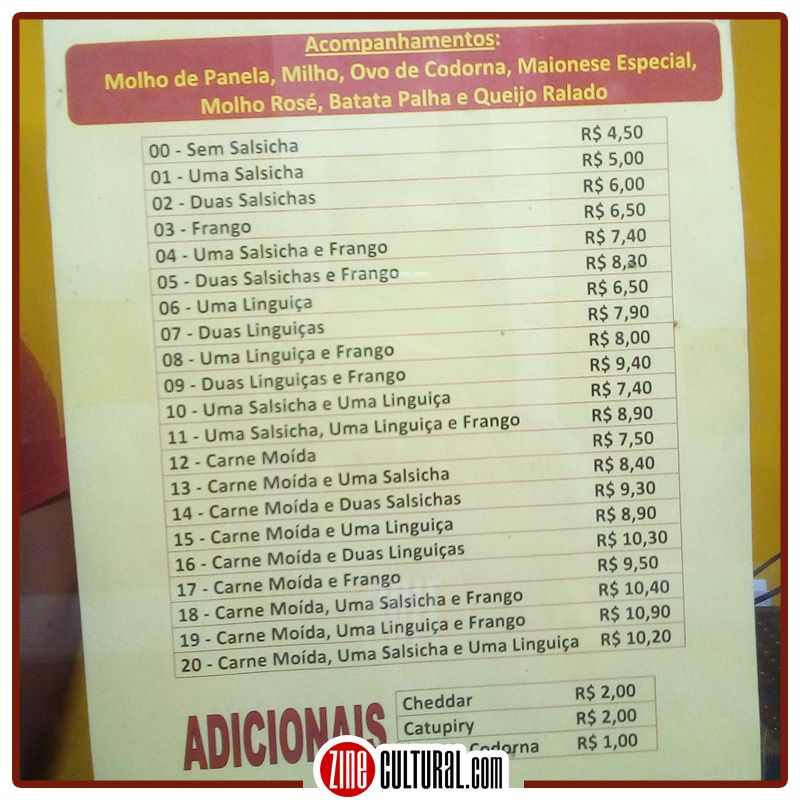 Essa lanchonete possui 20 opções de cachorro-quentes. Além da tradicional salsicha, existem várias combinações com ingredientes diferentes, como linguiça, frango e carne moída! Outro ponto positivo é ter vários acompanhamentos e a possibilidade de acrescentar outros produtos (cheddar, catupiry e ovo de codorna). Na parte das bebidas também há diferentes alternativas. Confira: