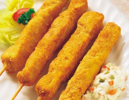 6º passo: Passar nos ovos batidos, em seguida na mistura de farinha de trigo com farinha de rosca