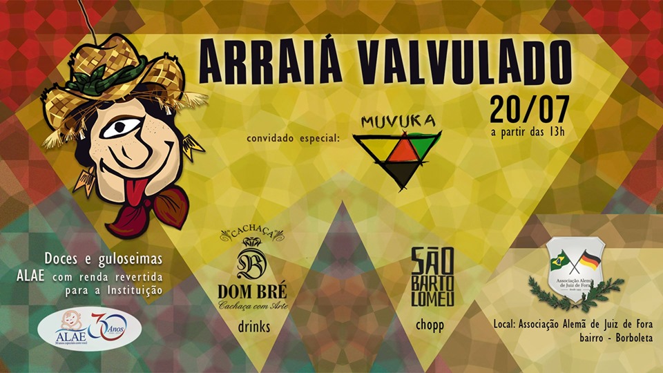 �YZ�Atrações: Bateria Valvulada, show do grupo Muvuka com sucessos do samba e reggae, chopp São Bartolomeu, drinks Cachaça Dom Bré, Comidas Típicas Juninas e barraquinha de doces e guloseimas da Alae, com renda revertida para a instituição.