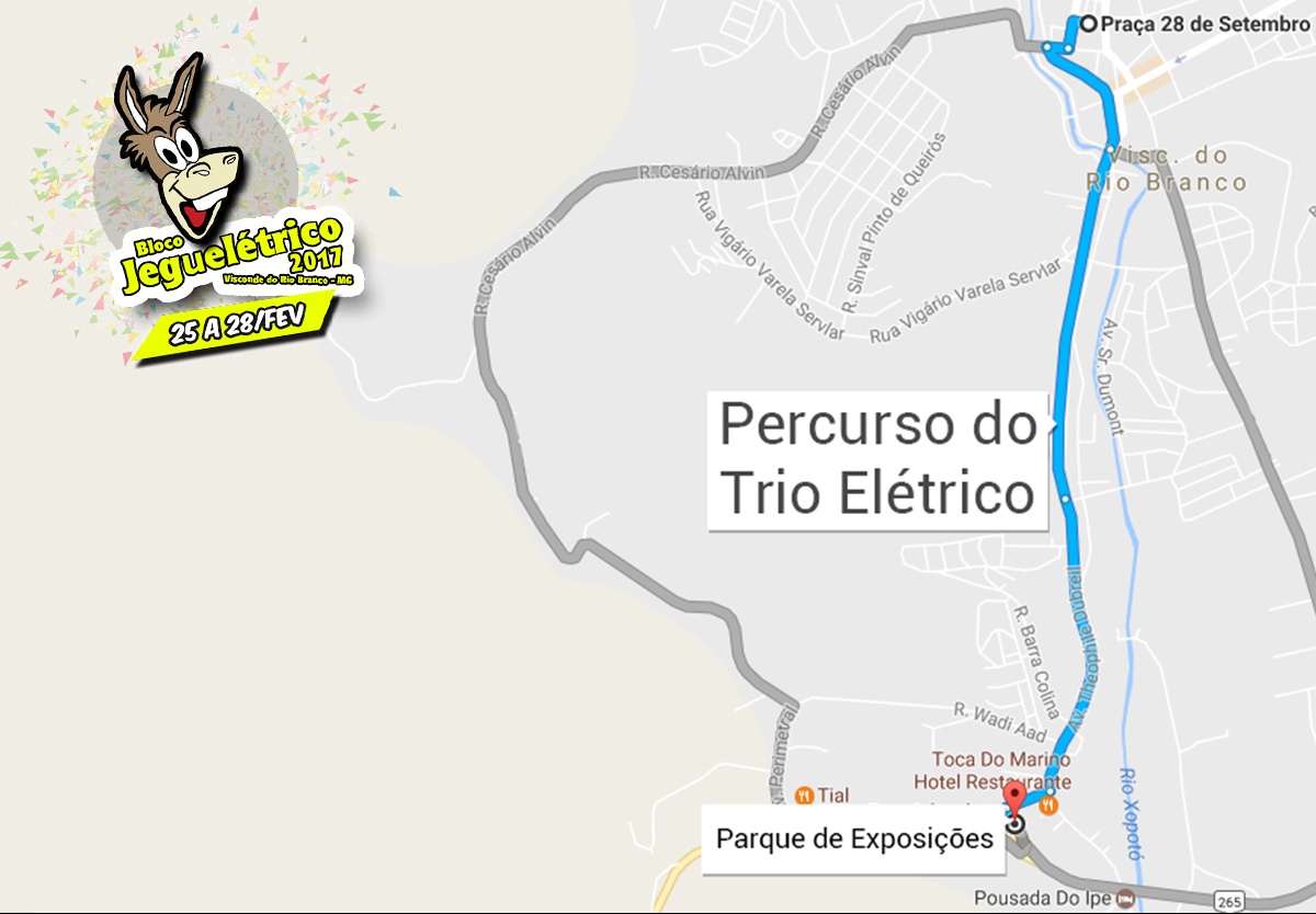 O bloco tem a concentração no Parque de Exposições e segue pela cidade de Visconde do Rio Branco com muita animação. A cidade para para acompanhar o Jeguelétrico, que é um dos blocos mais famosos do Brasil! Confira o trajeto:
