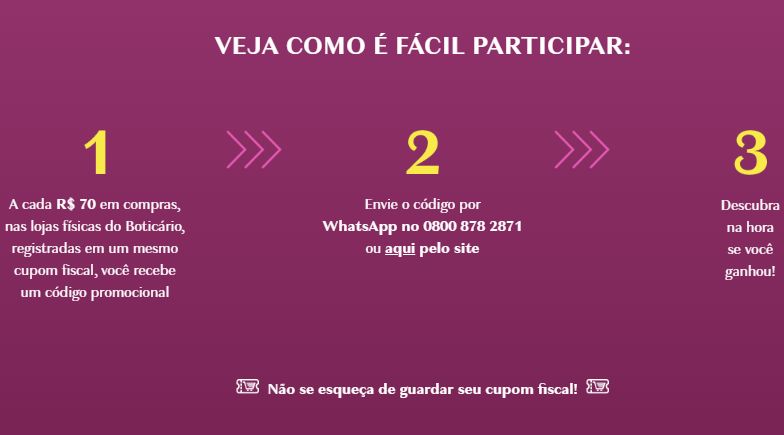 Entre os dias 30 de setembro e 21 de novembro, a cada compra no valor de R$ 70 em uma das mais de 3.750 lojas físicas e quiosques do Boticário espalhados pelo país, o consumidor recebe um código promocional impresso na nota fiscal para concorrer aos prêmios.