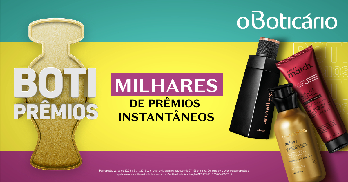 A nova ação de interação d'O Boticário com seus clientes é a Boti Prêmios. Nela, os consumidores irão se surpreender com cartões-presente de R$ 40 e R$ 100 para códigos promocionais premiados, divididos em mais de 27 mil cupons premiados por lojas de todo o Brasil.