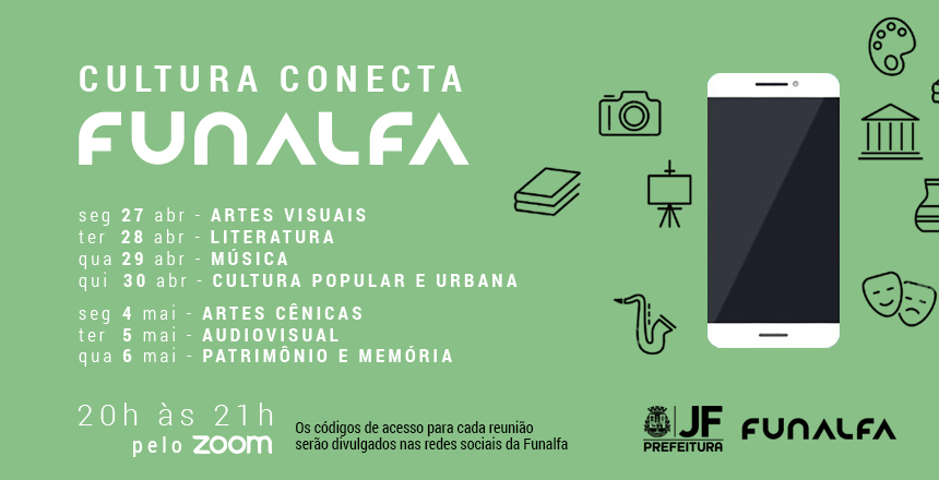 A Fundação Cultural “Alfredo Ferreira Lage” (Funalfa) lançou na última segunda-feira (27/04) o projeto virtual “Cultural Conecta”. A iniciativa tem o objetivo de estimular reuniões entre pessoas da classe artística para discussões sobre os impactos e as mudanças no cenário da cultural pré e pós pandemia do coronavírus e da covid-19.
