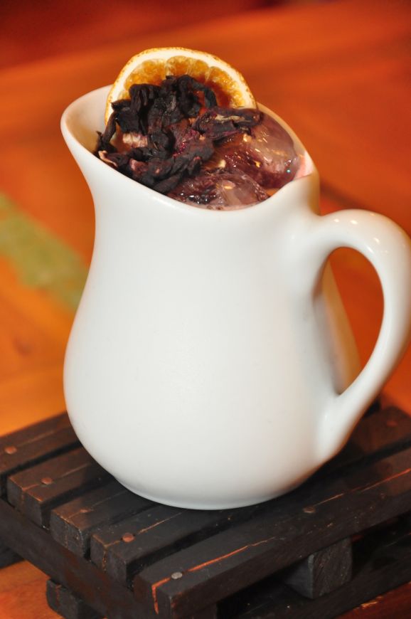 �Y���Y�� Ingredientes: Aperol, Chá de Hibiscus, Xarope de Mel, Limão