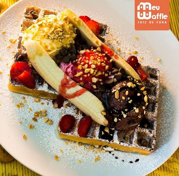 �Y~< Características: Este é um Waffle que une frutas e sorvete. Três bolas de sorvete já seria o suficiente, mas a Meu Waffle se superou e acrescentou à receita: banana, castanhas e morango.